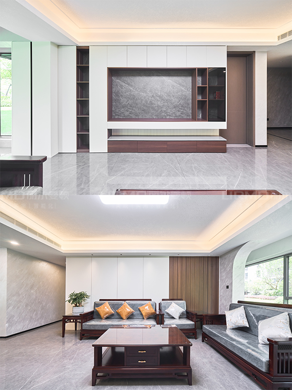 门墙柜一体化,沙发背景与电视背景收纳柜,做同色同材质,让单一的墙面不再单调
