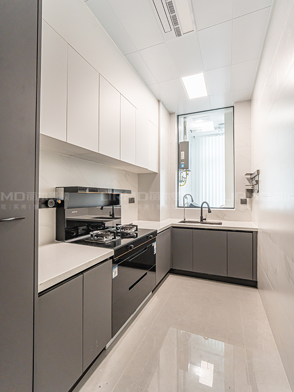 L 型橱柜以白色和灰色为主色调,简洁大方,易于清洁和维护
