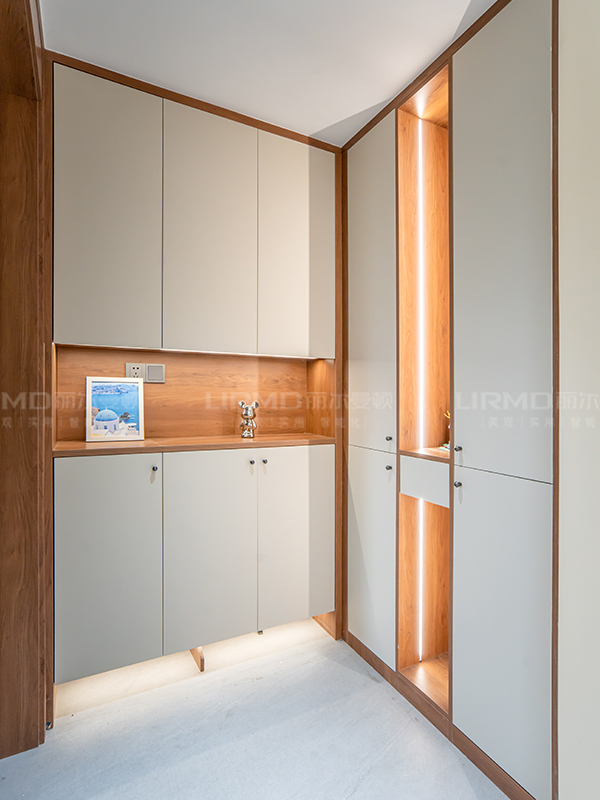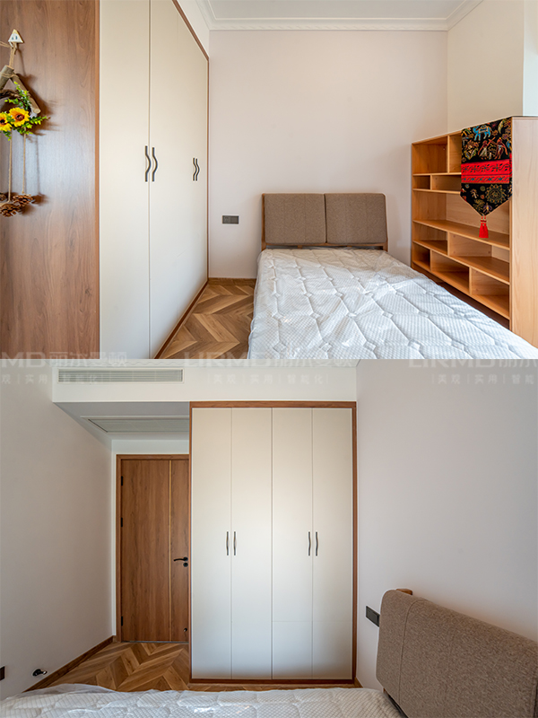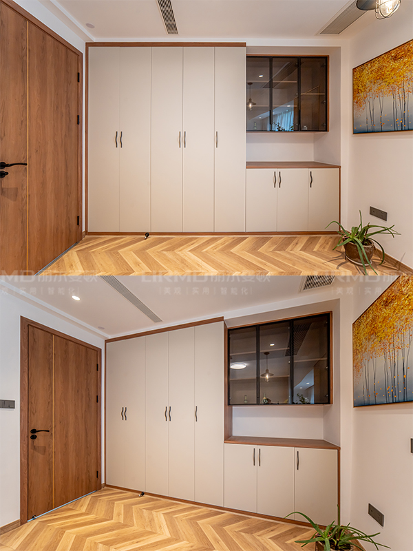 全屋定制:使用万象天冠品牌18厚环保ENF级杉木芯板柜体、山东丰源仙檀山欧松板大薄片肤感柜门、
