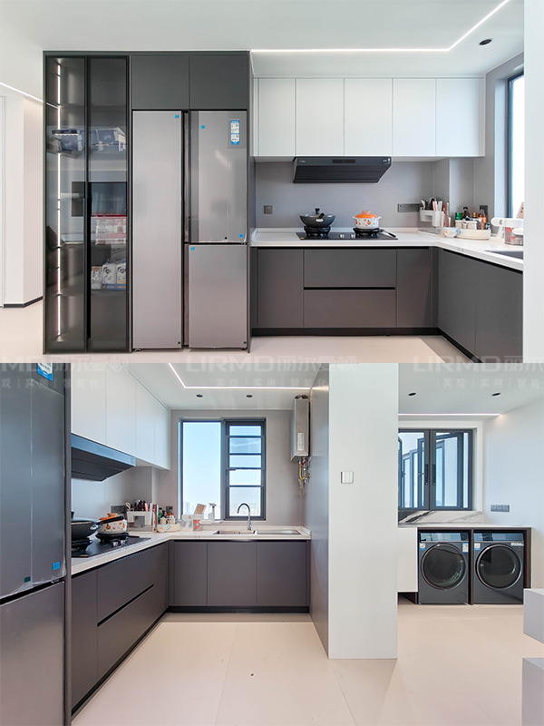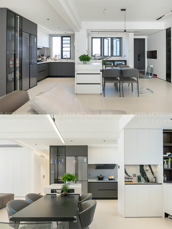 客餐厅、阳台、厨房、书房四合一设计,高效利用收纳空间。