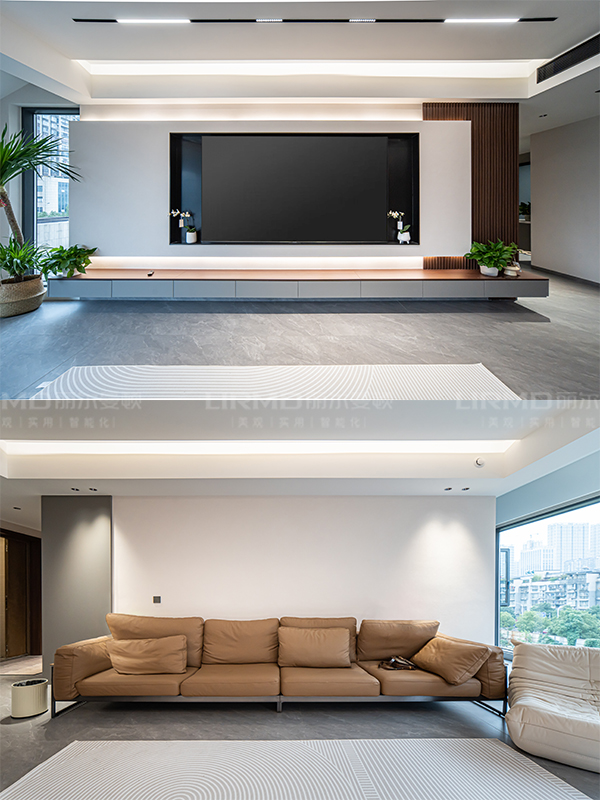 750*1.5m灰色瓷砖通铺,加上无主灯设计,显大又