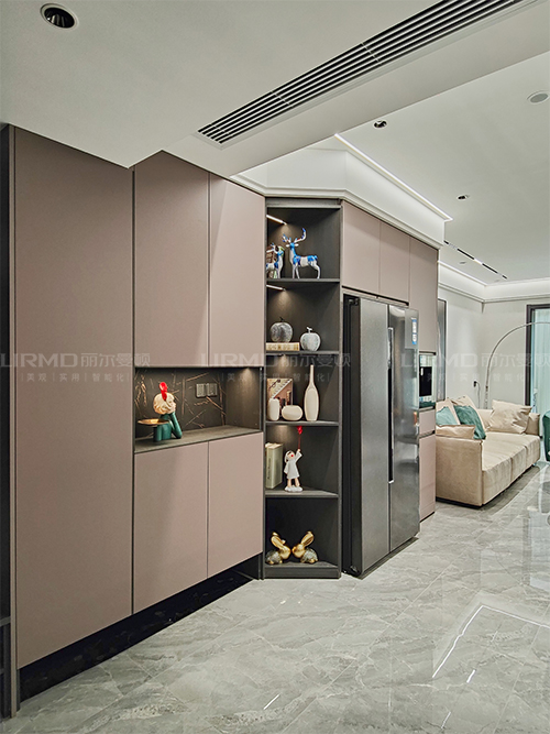 做了一个开放格的转角装饰柜来过渡嵌入式冰箱柜,整体美观大气又实用。