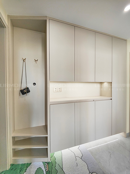 全屋衣柜、橱柜、房门、护墙板都选用奶咖色系配套。