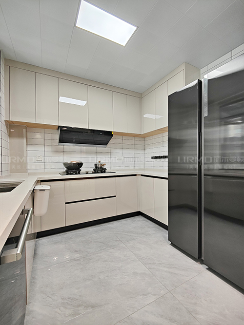橱柜选用高光柜门,抗手印耐油污,还可以增加厨房亮度显宽敞