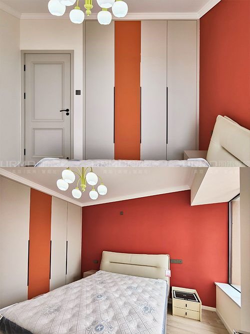 卧室朱红色的背景搭配一门到顶跳色柜门,简直不要太美啦!