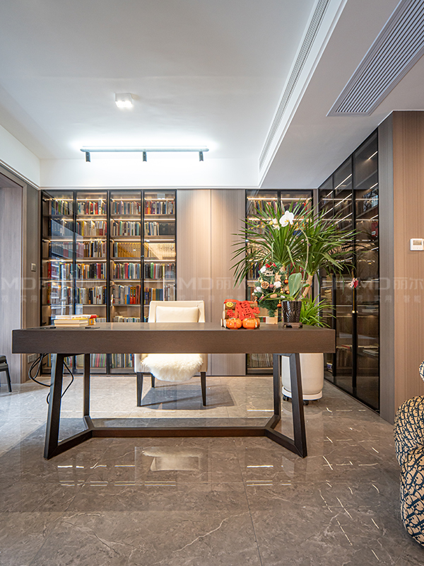 房客厅一体设计,空间通透明亮又舒适,整墙书柜满满的书香气,办公学习都毫无压力