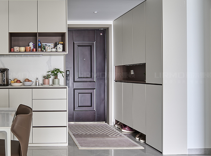 和墙面平齐,不占空间的同时收纳更加方便,右边通往小孩房的隐形门设计,