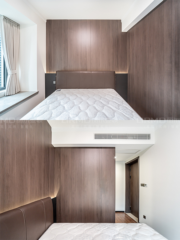 全屋门、墙、柜采用同款烟熏尤加利木纹饰面,避免色差,提升视觉延伸感