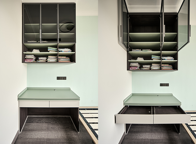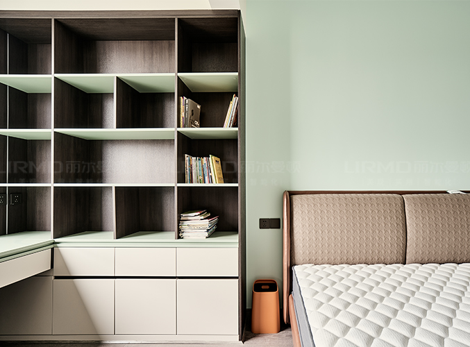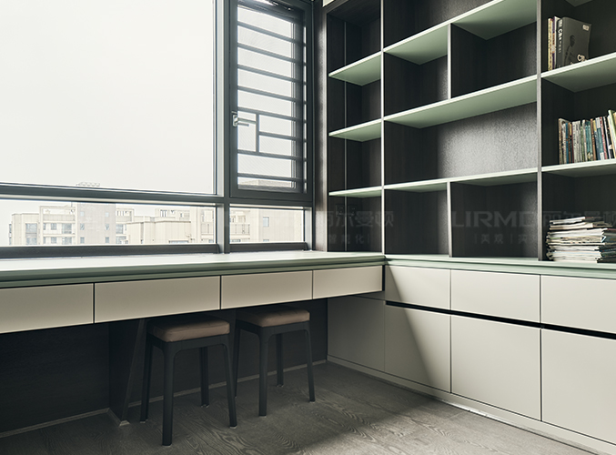 多组柜子设计,实木柜体搭配PET肤感柜门,收纳更方便,书柜加书桌的设计,