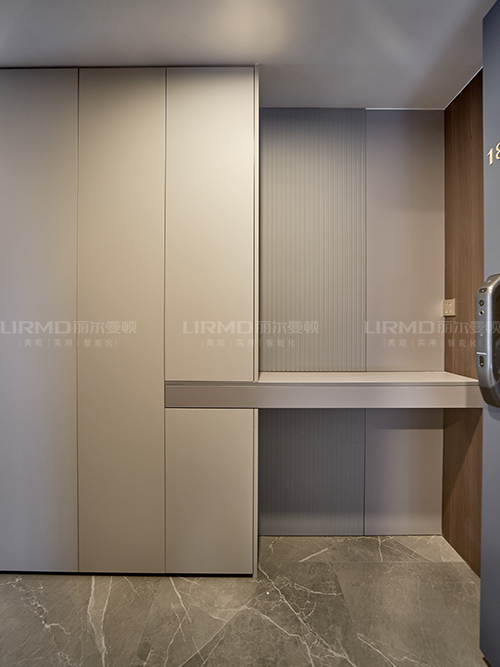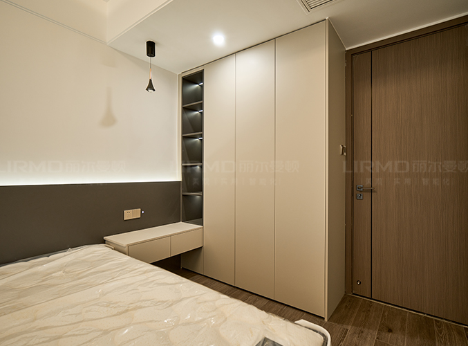 实木柜体搭配PET肤感柜门,一门到顶柜子设计+右侧悬空桌台设计,下方悬空设计,
