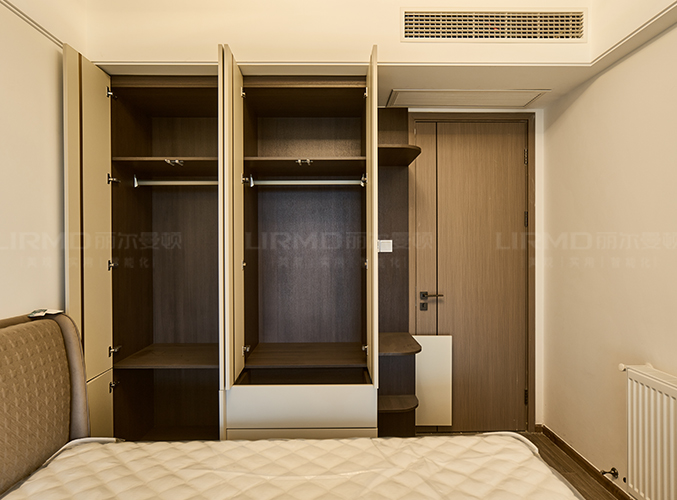 衣帽间做L型衣柜+一门到顶设计,三面柜门做落地穿衣镜功能性十足。