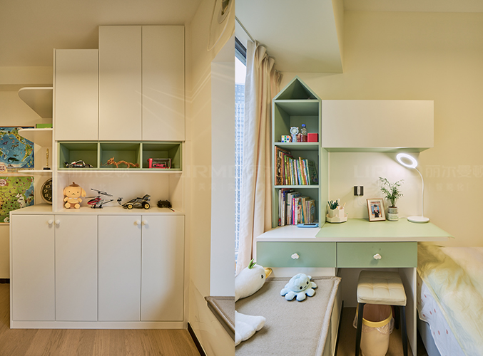 衣柜书桌一体化设计,学习办公两不误,选用清新绿色+白色打造温馨童趣空间。