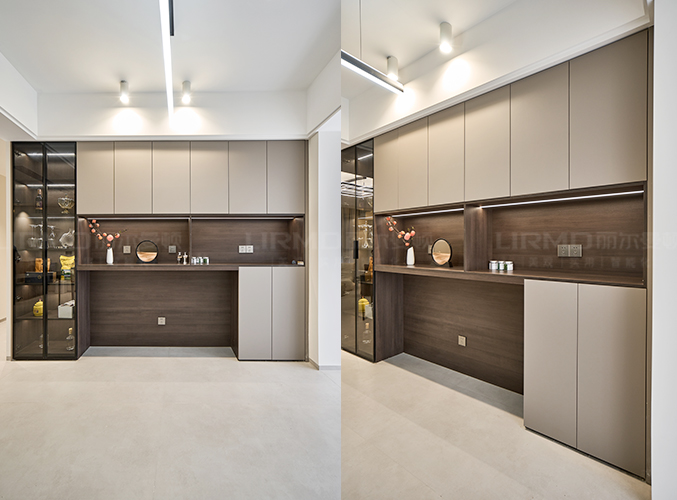 18mm厚杉木芯板,浅色柜门加深色柜体的碰撞,视觉效果更好,下方悬空设计,好放置鞋子,