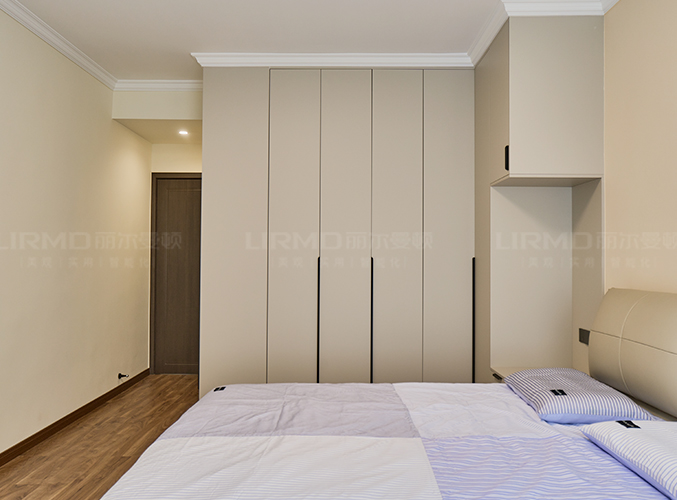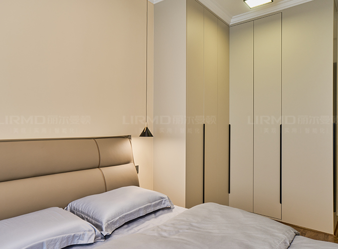 柜子一门到顶设计,实木柜体搭配PET肤感柜门,床边搭配暖色系吊灯,