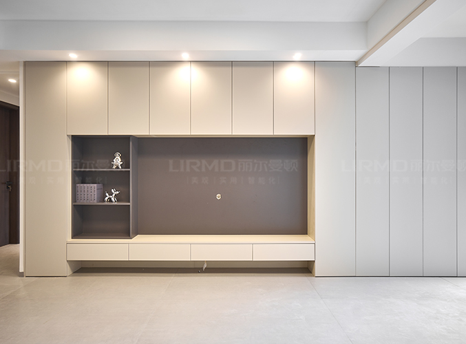 入户柜 肤感鞋柜+一门到顶无拉手设计,柜墙一体化尽显极简之美。 ,内嵌式电视设计,不占空间。 满足各种储物需求。 搜索“丽尔曼顿”http://www.lrmdjj.com/官网,获取更多装修知识! 搜索“丽尔曼顿家居”微信公众号和小程序,了解更多报价! 空间展示