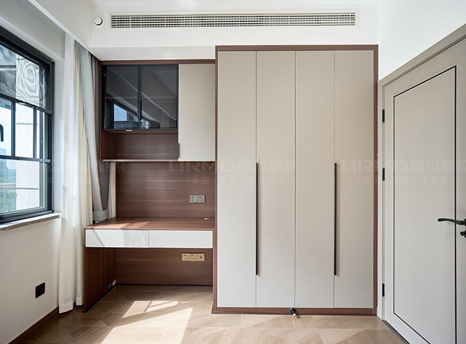 满墙衣柜+同色系背景墙,超大阳台放置梳妆台采光好,衣柜+书桌一体设计,储物学习更方便。