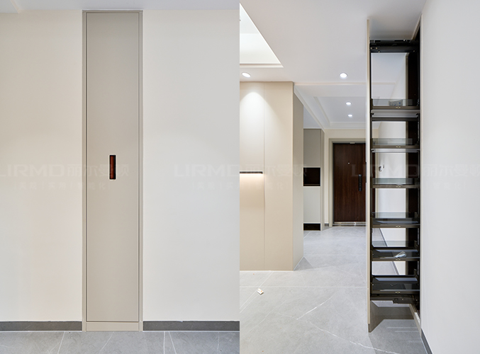 入户柜 下方悬空设计,好放置鞋子。 既不沉闷又显。 可以摆放书籍和化妆品。 搜索“丽尔曼顿”http://www.lrmdjj.com/官网,获取更多装修知识! 搜索“丽尔曼顿家居”微信公众号和小程序,了解更多报价! 空间展示