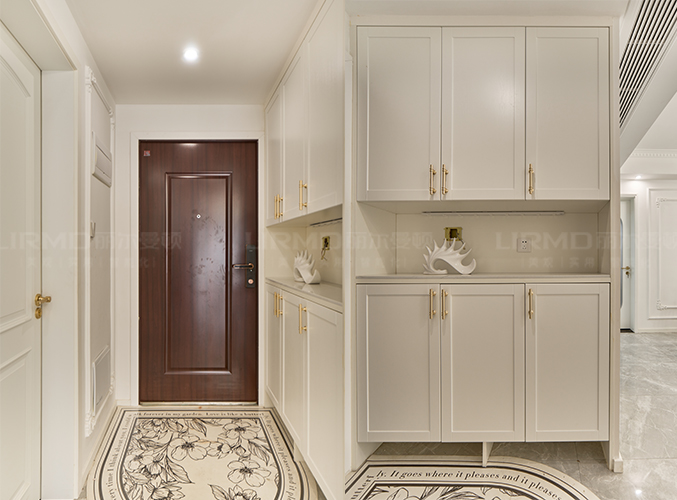 奶油色鞋柜搭配置物花纹脚垫,柜子中间内嵌设计,可以放置钥匙包包等物品,