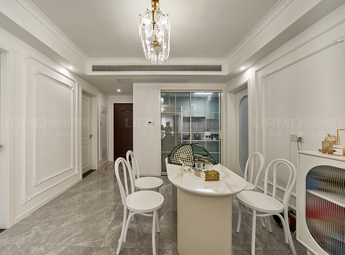 餐厅比邻厨房,餐桌椅选奶白色及线条圆润柔和的造型,与周围法式风格相呼应。