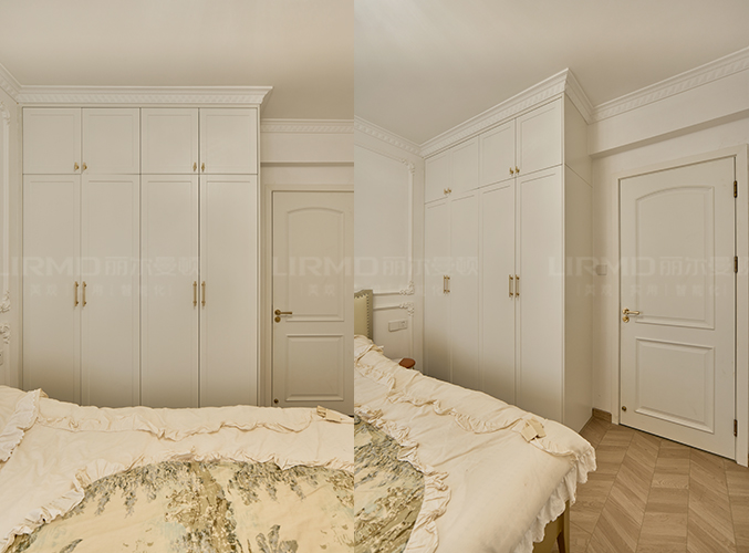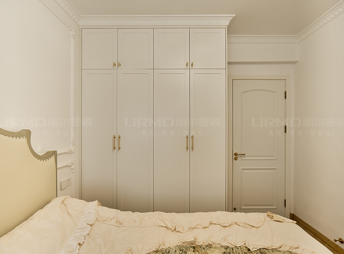 卧室延续客厅风格以奶油色为基调,靠墙做整衣柜,实木柜体搭配PET肤感柜门,