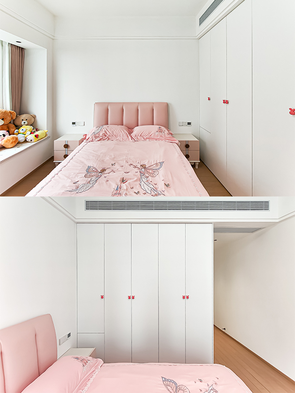 空间充分利用了起来,收纳功能强大。木色柜门无把手设计,视觉上感觉很干净清爽