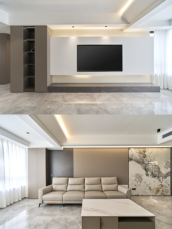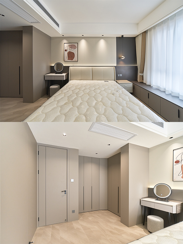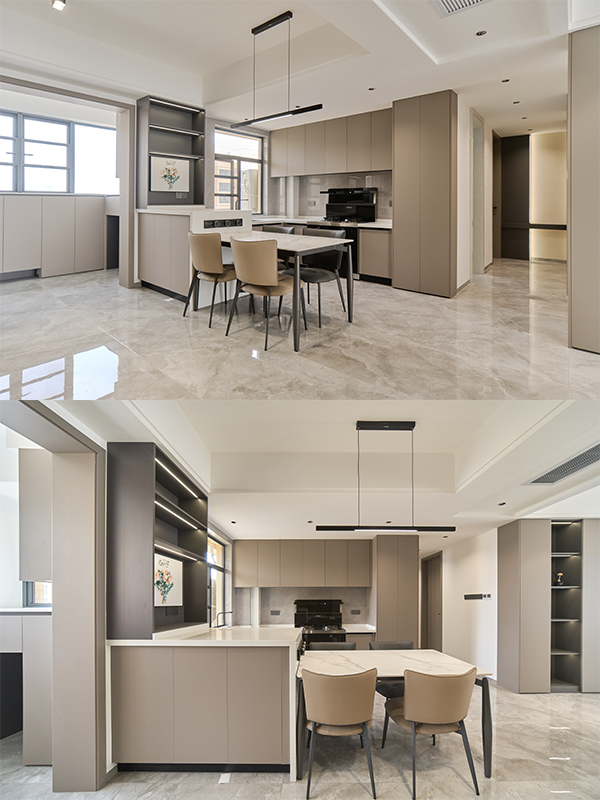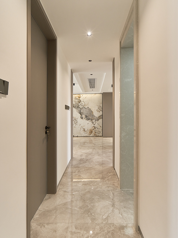 门墙柜一体化,柜子济州灰与木卡其的搭配为整个空间的主色调,地面砖的大理石灰为基础色调