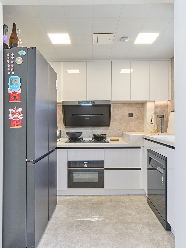 L 型橱柜充分利用转角空间,整体灵活多变,合理的动线设计让业主在烹饪时事半功倍