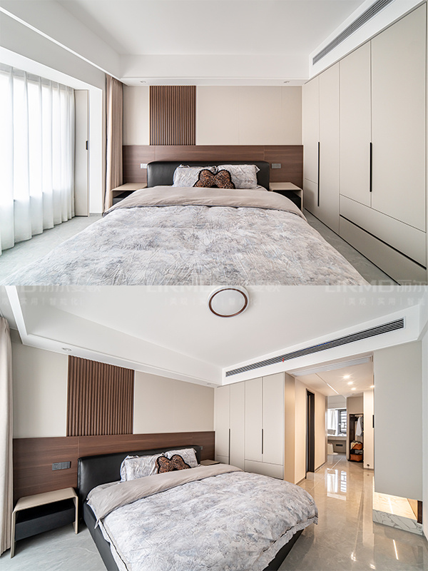 隐形设计:所有门套、踢脚线做极简收口,连空调风口都定制同色格栅,强迫症狂喜