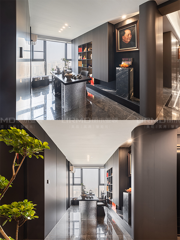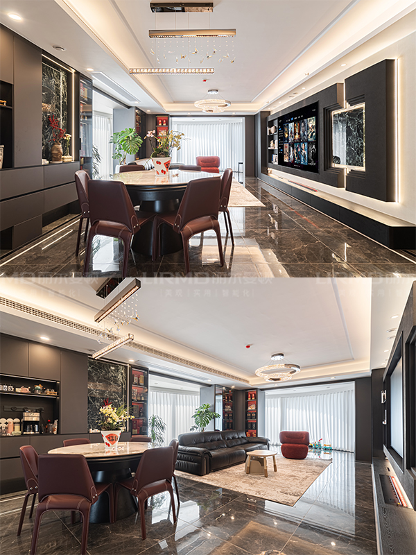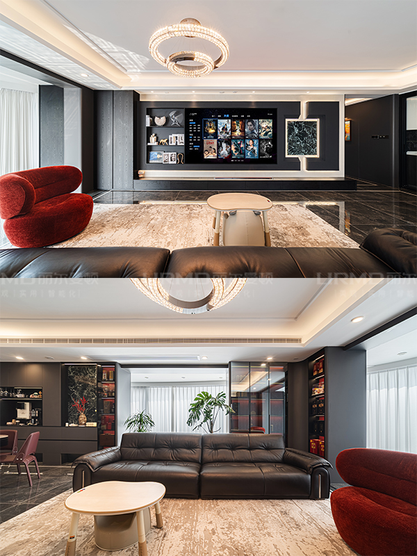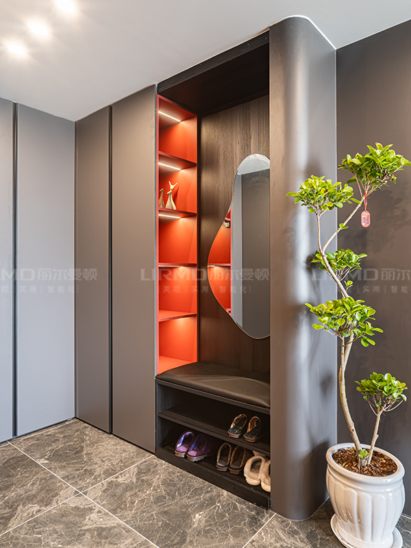 用深灰木饰面+黑金质感+暖橙点缀,把意式轻奢的精致与克制演绎得淋漓尽致,每一处细节都透着高级感。