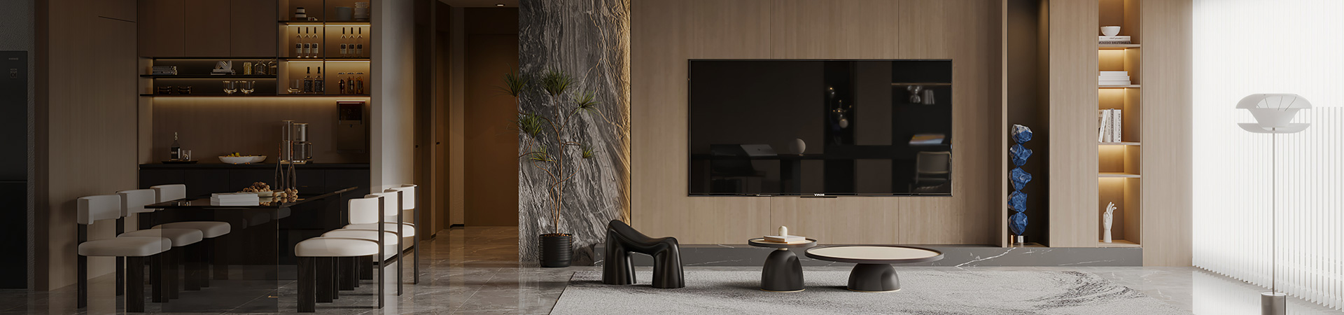 打通书房和客厅,阳台通铺,无主灯+灵动射灯+暖色氛围灯,柔光砖全屋通铺,明亮又治愈。