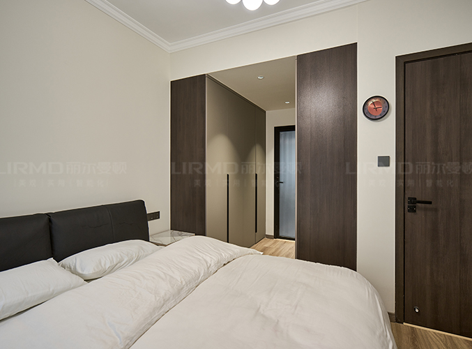 卧室延续极简风格,卫生间通道两侧到顶衣柜做衣帽间,暖色灯光搭配木纹地板营造温馨氛围。