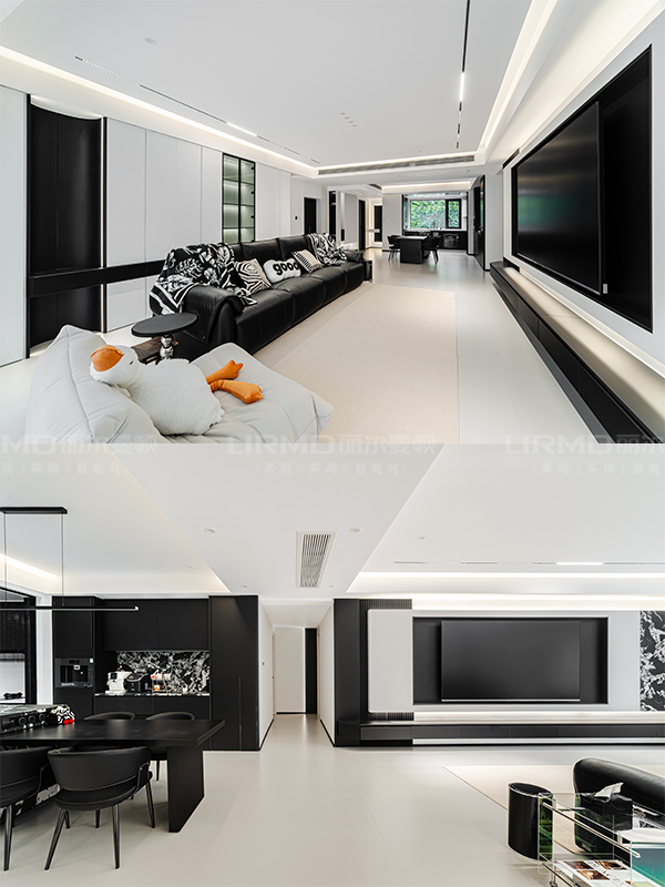 搭配各类软装突出个性质感。在客厅大平层明暗区分与虚实结合的环境中,以求达到自由轻松惬意,